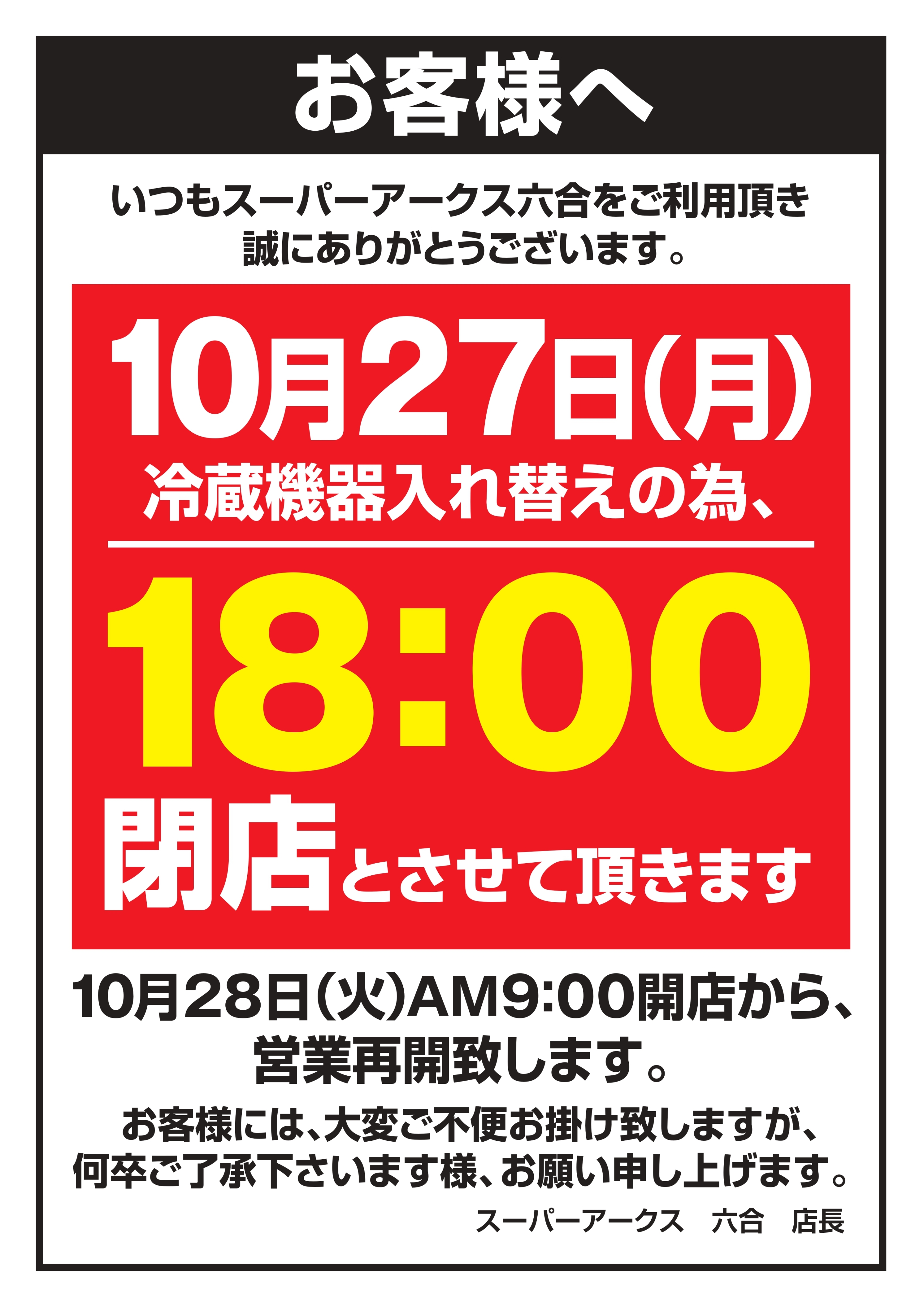 【スーパーアークス六合店からのお知らせ】10月27日(月)冷蔵機器入れ替えの為、18:00閉店とさせていただきます。