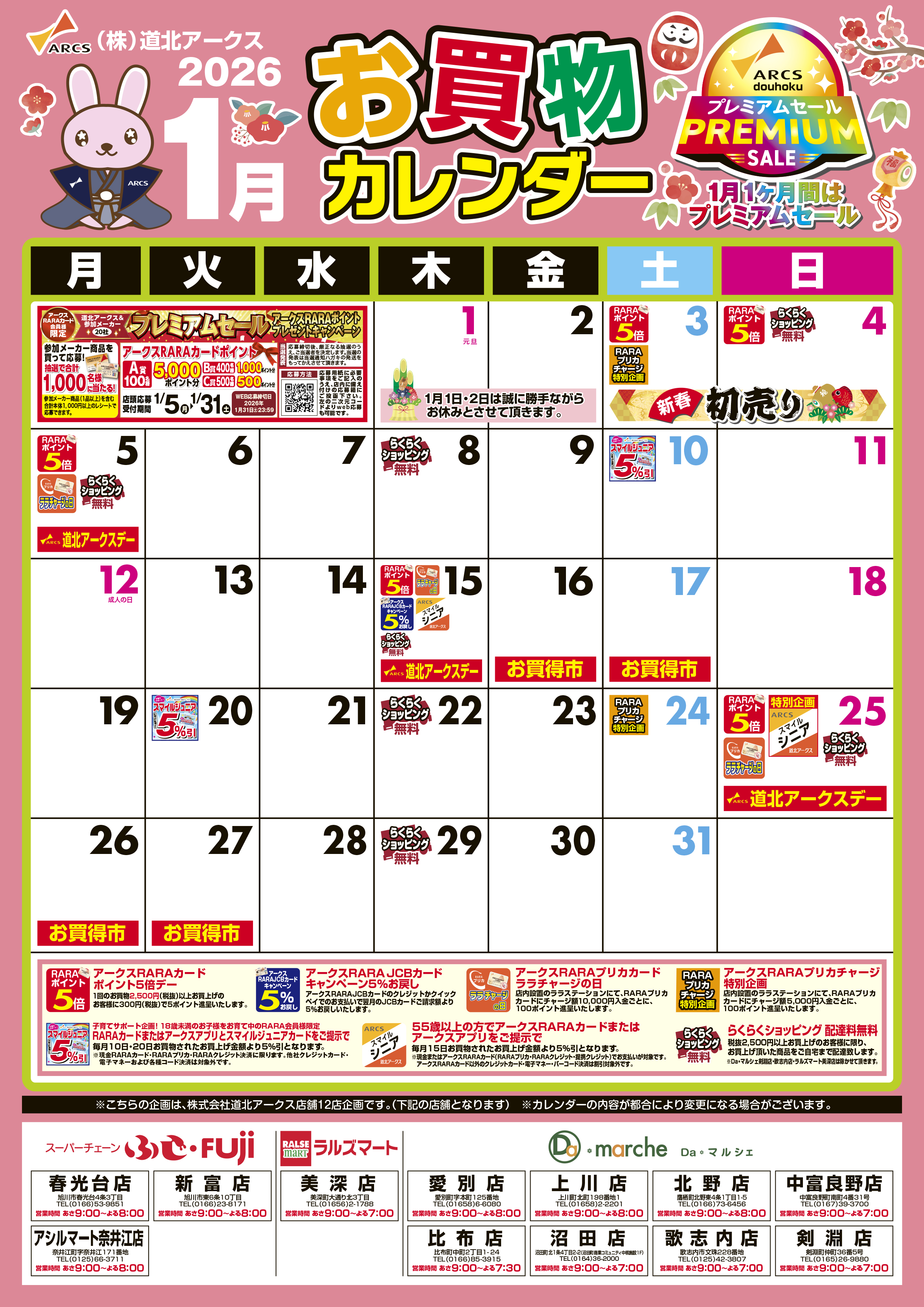 【スーパーチェーンふじ春光台店・新富店・アシルマート奈井江店/ラルズマート美深店/DAマルシェ⑫店舗】(株)道北アークス 1月お買い物カレンダー