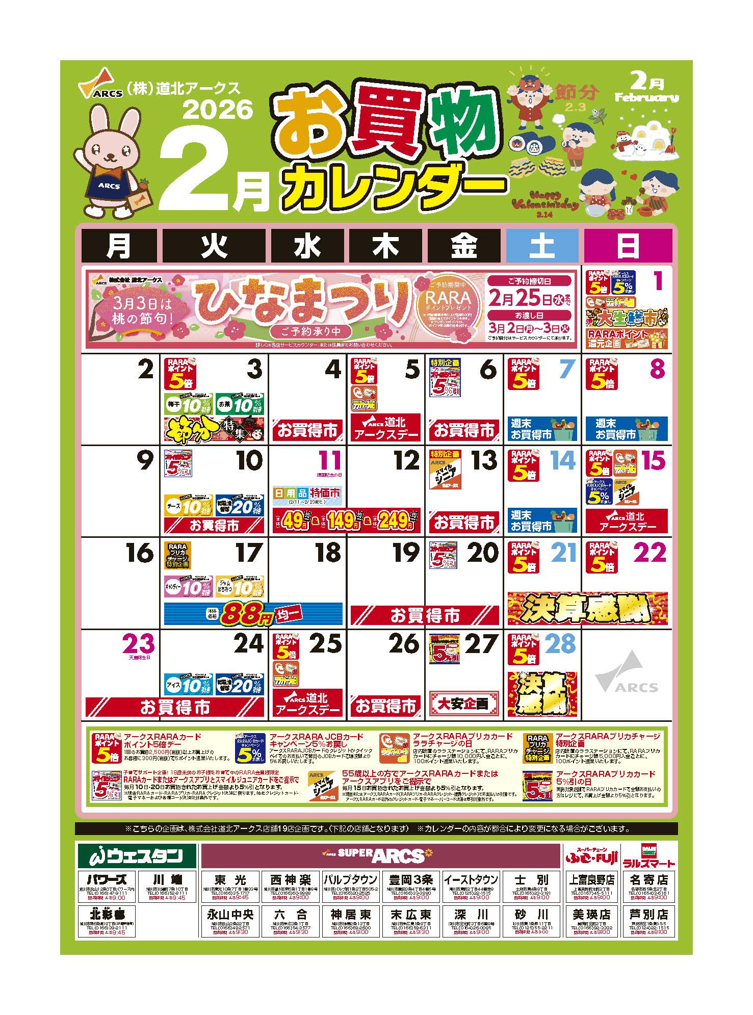 【ウエスタン/スーパーアークス/スーパーチェーンふじ上富良野店・美瑛店/ラルズマート名寄店・芦別店⑲店舗】(株)道北アークス 2月お買い物カレンダー