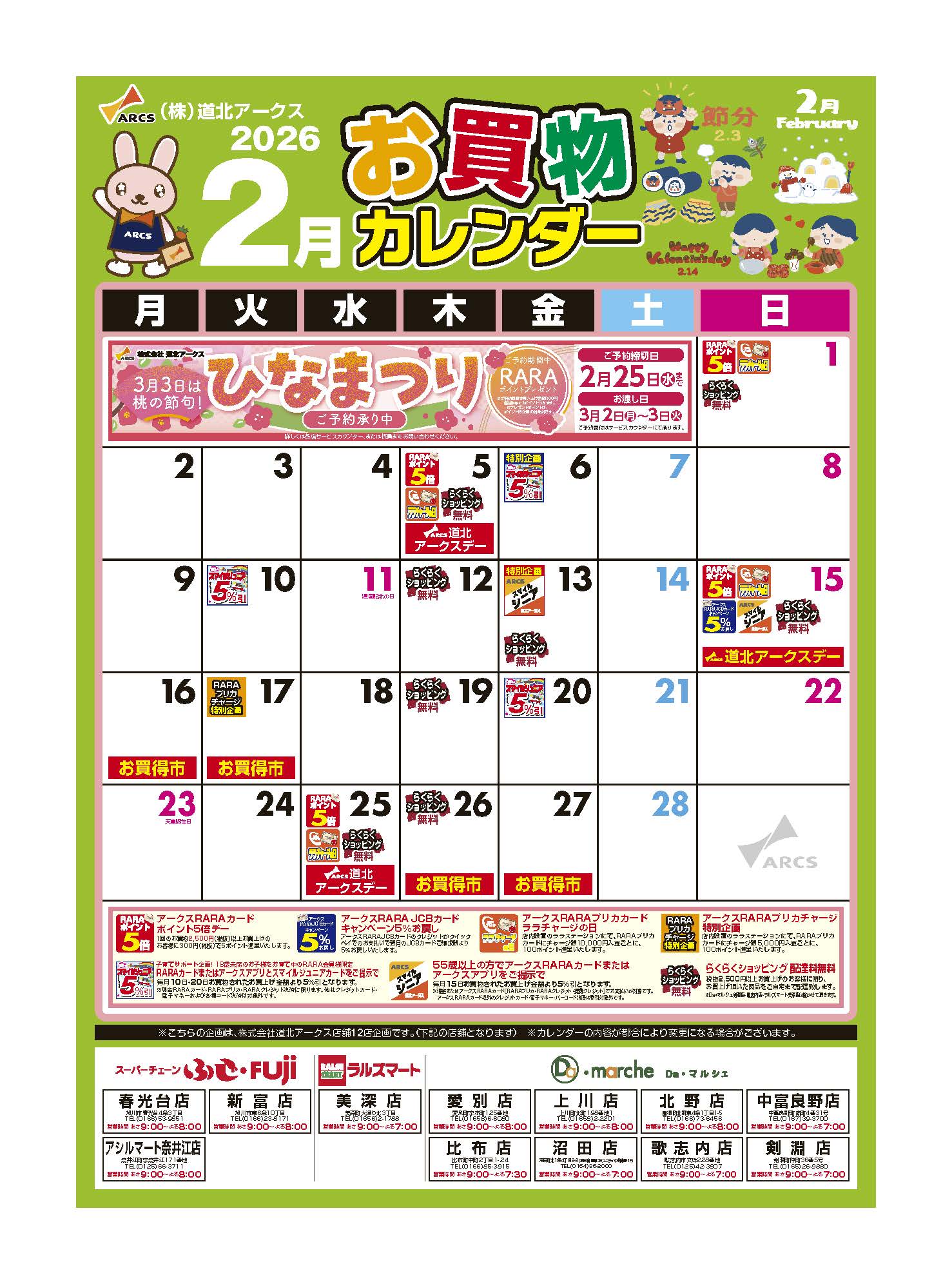 【スーパーチェーンふじ春光台店・新富店・アシルマート奈井江店/ラルズマート美深店/DAマルシェ⑫店舗】(株)道北アークス 2月お買い物カレンダー
