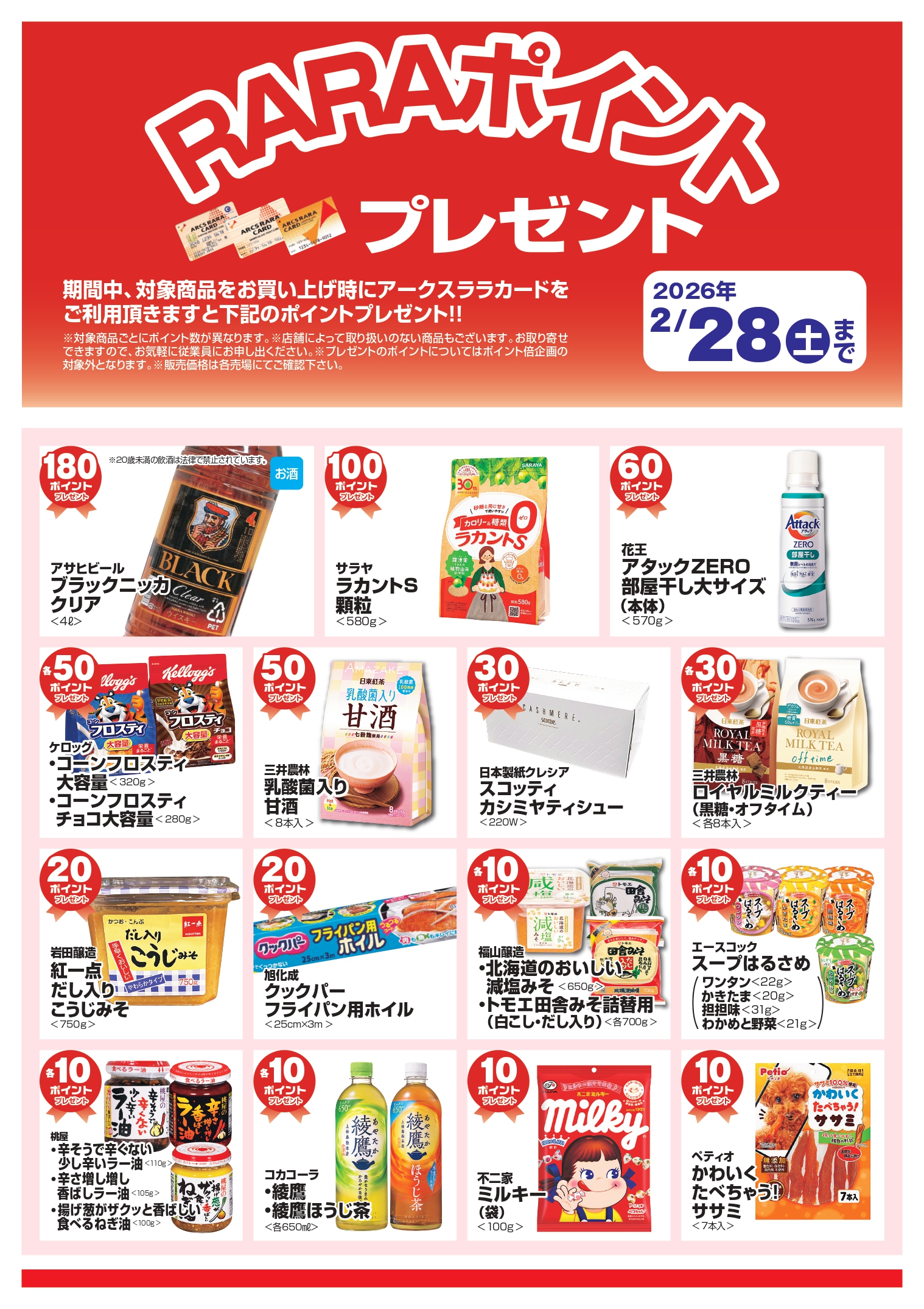 ●実施期間 : 2026年2月1日㊐~2月28日㊏まで●期間中、対象商品をお買い上げ時にアークスララカードをご利用頂きますと上記のポイントをプレゼント!※対象商品ごとにポイント数が異なります。※店頭によって取り扱いの無い商品もございます。※プレゼントのポイントについてはポイント倍企画の対象外となります。※販売価格は各売場にてご確認ください。