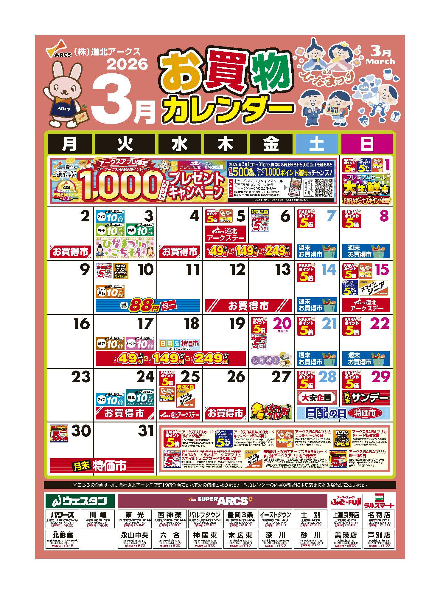 【ウエスタン/スーパーアークス/スーパーチェーンふじ上富良野店・美瑛店/ラルズマート名寄店・芦別店⑲店舗】(株)道北アークス 3月お買い物カレンダー