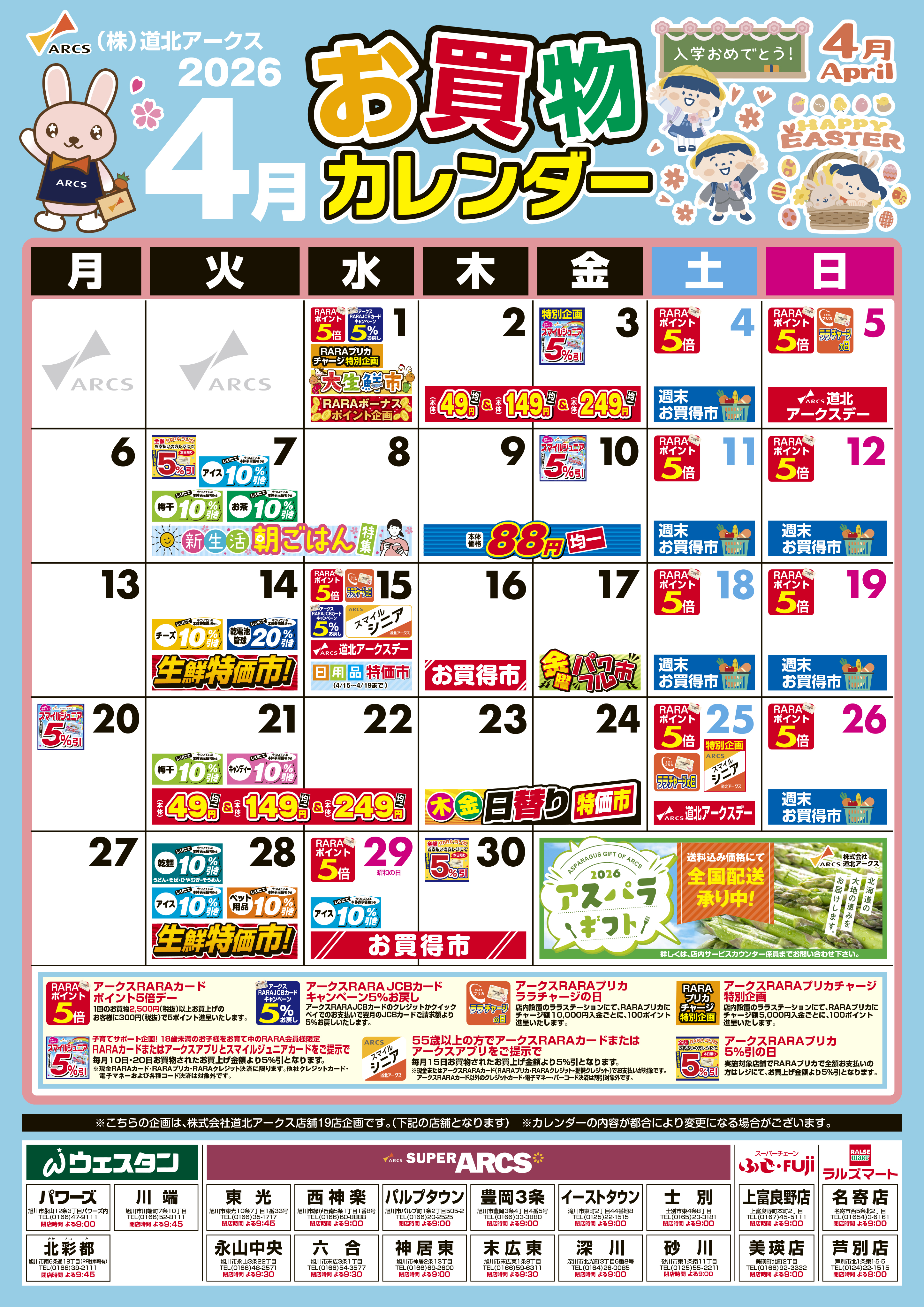 【ウエスタン/スーパーアークス/スーパーチェーンふじ上富良野店・美瑛店/ラルズマート名寄店・芦別店⑲店舗】(株)道北アークス 4月お買い物カレンダー